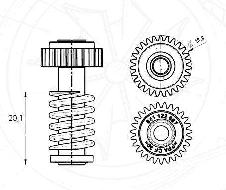 Пластикова шестерня з зносостійкого матеріалу PPA-CF30, PPACF30. Черв'як сервоприводу або черв'ячна передача сервоприводу турбіни. Довідковий розмір "С", Аналог: 667, CF555, 36-01-012, 641-122-667, 641122667. Застосовується в блоках Hella 6NW009550, 6NW009228, 6NW009660. Має 5 витків, діаметр 16,9 мм. Дана шестерня "С" застосовується при ремонті електронних сервоприводів турбін виробництва Hella. Шестірня поставляється в станодортном оригінальному розмірі, для досягнення кращого результату при ремонті актуатора турбіни, необхідно міняти разом з секторів позиції розміру "С", а також з підшипниками сектора. G-88, G-22, G-25, G-20, G-17, G-16, G-001, G-59, G-36, G-33, G-82, G-77, G-70, G-67, G-66, G-83